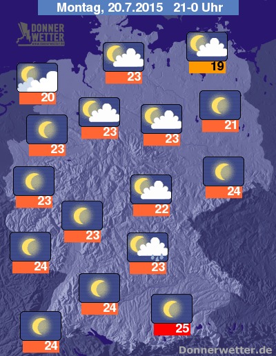 Heute Abend ist der Himmel über Deutschland zum Großteil sternenklar oder gering bewölkt. Nur gebietsweise zieht auch mal starke Bewölkung durch, dabei sind auch vereinzelte Schauer möglich, sonst bleibt es aber trocken. Die Abendtemperatur liegt bei 25 Grad in München und bei etwa 19 Grad in Neubrandenburg.