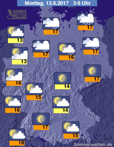 In der folgenden Nacht ziehen über den Norden dichte Wolken hinweg, die hier gebietsweise Schauer und örtlich auch Gewitter bringen. Über der Südhälfte Deutschlands ist es hingegen meist nur locker bewölkt oder sogar sternenklar und dazu trocken. Die Temperatur sinkt auf 18 Grad in Freiburg und bis 13 Grad am Niederrhein.