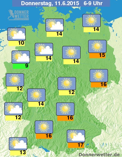 Die Temperaturen liegen am Morgen bei Werten um 9 Grad C im Münsterland und um 17 Grad C im Chiemgau.