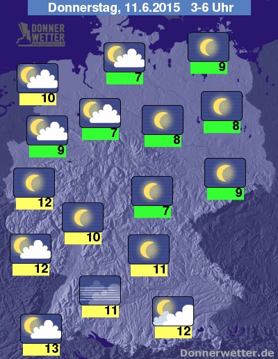 Niederschläge sind bei Tiefstwerten um 12 Grad C im Alpenvorland und 7 Grad C im Thüringer Wald nicht zu erwarten.