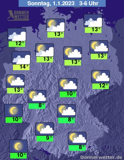 In der folgenden Nacht zeigt sich der Himmel über der Südhälfte der Republik verbreitet nur locker bewölkt oder sternenklar. Weiter nach Norden hin ist es zunehmend bewölkt und oft auch bedeckt. Es bleibt weitgehend trocken bei Tiefstwerten von 14 Grad in Münster und 8 Grad in Augsburg. Über der Nordhälfte weht ein oft stärkerer bis stürmischer Wind. An den See herrscht Sturm.