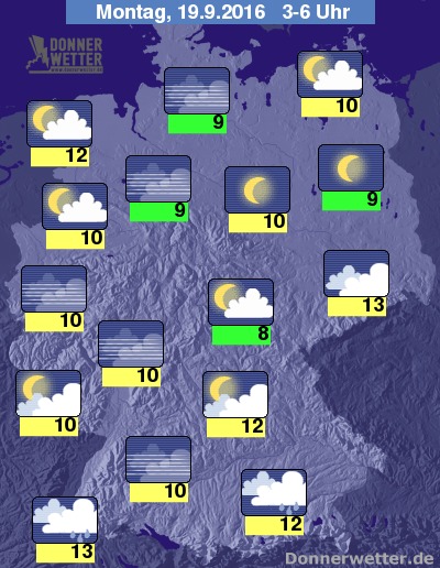 Wo es aufklart, sinken die Temperaturen auf Werte um 9 Grad C, sonst werten Temperaturen um 13 bis 10 Grad C erreicht.
