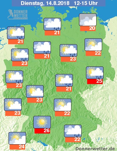 Heute Abend bilden sich über dem Norden und dem Alpenvorland noch einzelne Schauer, selten auch Gewitter, sonst klingen letzte Schauer rasch ab und di Sonne kann sich zum Großteil zeigen. Die Temperatur liegt bei 21 Grad in Cuxhaven und etwa 26 Grad in Stuttgart.
