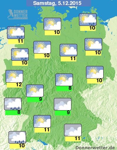 Am Samstag ziehen meist viele und oft auch dichte Wolken durch, dabei fällt im Norden, Westen und Südwesten gebietsweise Regen, hier und da kann sich aber auch die Sonne zeigen und in den übrigen Regionen bleibt es auch meist trocken. Es werden 8 bis 12 Grad erreicht, dabei weht im Westen und Norden ein teils starker, an der Nordsee stürmischer Wind.