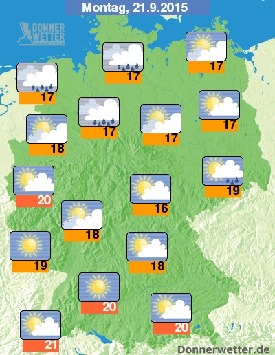 Am Montag ziehen vor allem über Norddeutschland oft dichte Wolken hinweg, die hier und da für Regenfälle sorgen können. Im Süden des Landes ist es dagegen überwiegend heiter bis sonnig und dazu trocken. In der breiten Mitte der Republik zieht größtenteils wechselnde Bewölkung durch. Im Osten können die Wolken auch mal dichtere sein, Regen fällt dabei aber nur selten, sonst bleibt es ohnehin trocken. Die Temperatur steigt auf 16 Grad im Vogtland und bis 21 Grad im Breisgau.