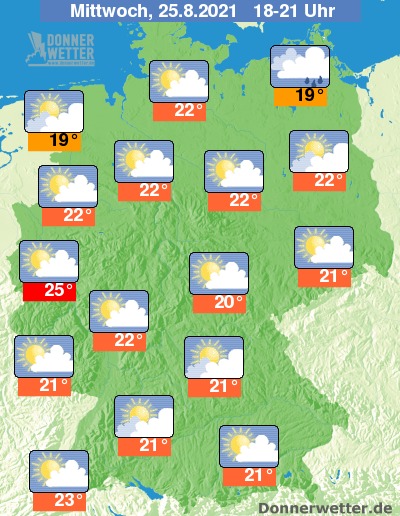 Heute Abend sorgen kompakte Wolken im Nordosten gebietsweise für einzelne Schauer. Im Norden ist es teils stark, oft aber auch nur locker bis aufgelockert bewölkt, dazu bleibt es trocken. Im übrigen Bundesgebiet ist es überwiegend heiter bis sonnig, nur örtlich sind auch mal mehr Wolken möglich, dabei bleibt es trocken. Die Temperatur liegt bei 19 Grad in Rostock und bis 25 Grad in Köln.
