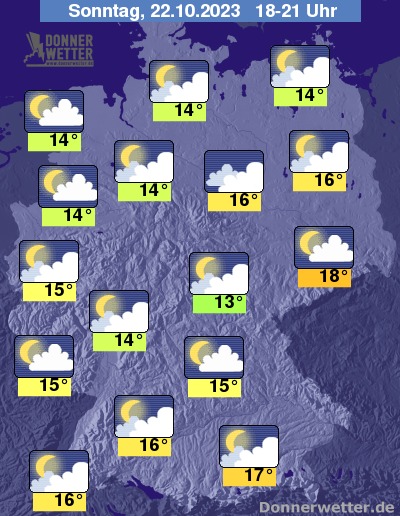 Heute Abend ist es über der Bundesrepublik häufig locker bis aufgelockert bewölkt. Gebietsweise hält sich aber auch dichtere Bewölkung, jedoch bleibt es weitgehend trocken. Die Temperatur liegt bei 13 Grad in Jena und rund 18 Grad in Dresden. An den Küsten weht noch ein teils stürmischer Wind.