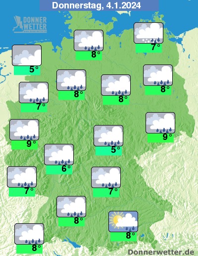 Am Donnerstag zeigt sich der Himmel meist stark bewölkt oder es ist bedeckt, dabei muss vor allem vom Niederrhein über die Mitte bis in die südöstlichen Mittelgebirge zeitweise mit schauerartigem Regen gerechnet werden. Im äußersten Nordosten fallen die Niederschläge teils auch als Schneeregen oder Schnee - Vorsicht Glättegefahr!