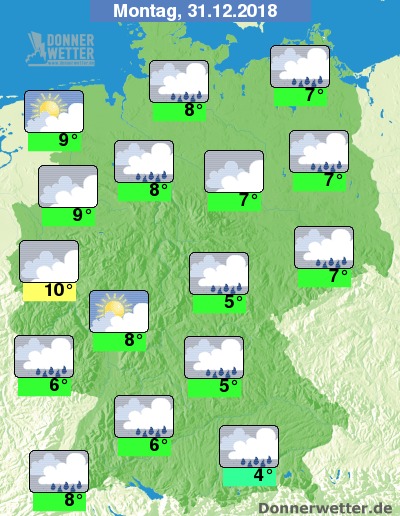Zum Start in die Woche bzw. am letzten Tag in 2018 erwartet uns verbreitet trübes und auch zeitweise nasses Wetter. Auflockerungen sind dabei besonders über der Westhälfte am Nachmittag möglich. Zum Abend und gegen Mitternacht regnet es über der Nordhälfte des Landes sowie im Südosten Deutschlands gebietsweise, sonst bleibt es hingegen zum Feuerwerk weitgehend trocken. Die Temperatur erreicht 4 Grad rund um München und bis 10 Grad in der Kölner Bucht.