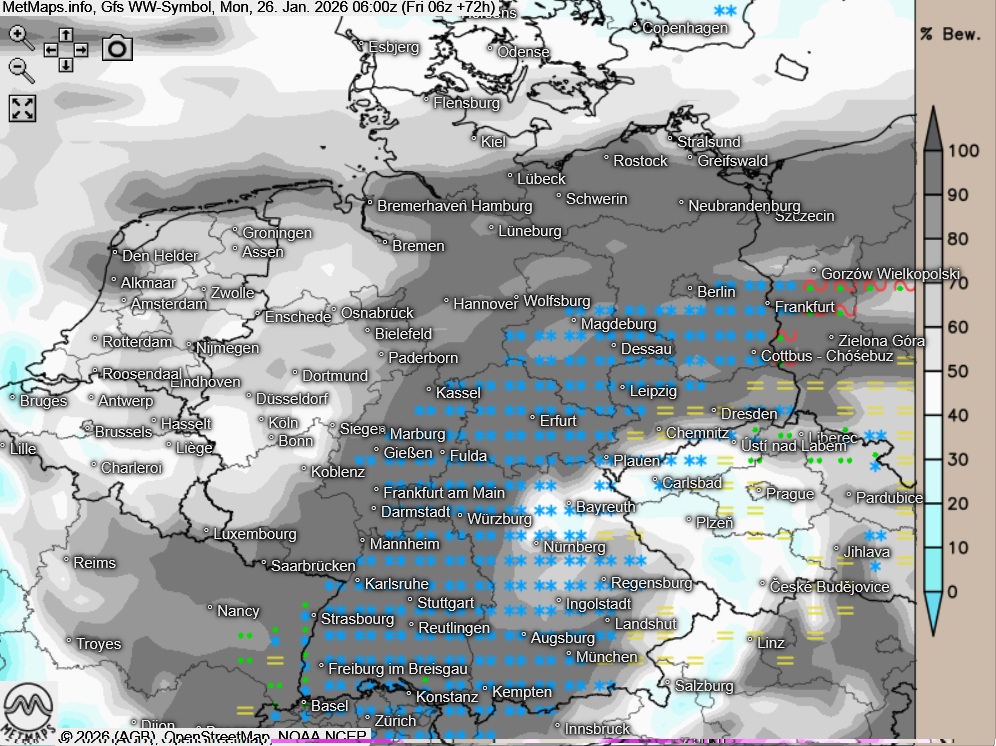 Die Temperaturen erreichen Höchstwerte um -2 bis 2 Grad in der Osthälfte, sonst -1 bis 5 °C.