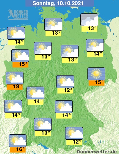 Am Sonntag ist es gebietsweise stark bewölkt oder auch neblig-trüb, vielerorts wird es aber auch sonnig. Es bleibt überall trocken bei Höchstwerten von 12 Grad in Erfurt und bis 18 Grad in Bonn.