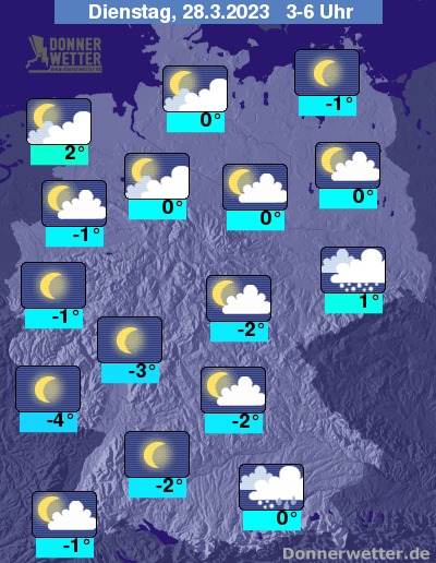 In der kommenden Nacht können sich über Bayern und Sachsen bei teils dichten Wolken noch einzelne Schneeschauer bilden. Im übrigen Land ist es verbreitet locker bewölkt oder sternenklar und es bleibt trocken. Die Temperatur sinkt auf 2 Grad in Wilhelmshaven und -4 Grad in Saarbrücken.