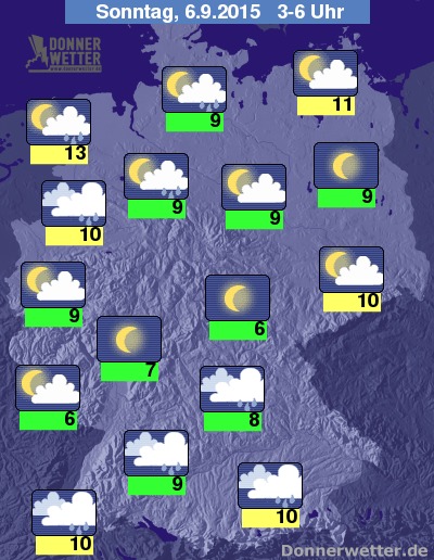 In der kommenden Nacht halten sich im Süden meist dichte Wolken, aus denen immer wieder, zum Teil auch anhaltender Regen fällt. Im Nordwesten und gebietsweise auch im Norden ziehen ebenfalls dichte Wolken auf, dabei sind einzelne Schauer möglich. Im übrigen Bundesgebiet ist es hingegen meist sternenklar oder nur locker bewölkt und dabei trocken. Im Norden weht ein frischer bis starker, an der Küste ein stürmischer Wind. Die Temperatur sinkt auf 13 Grad in Ostfriesland und bis 6 Grad im Coburger Land.