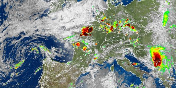 Unser Satellitenbild zeigt jede Menge Gewitter rot gefärbt über Deutschland. In schülwarmer Luft war es ein gewittriger Samstag. Mehr Satellitenbilder finden Sie hier.