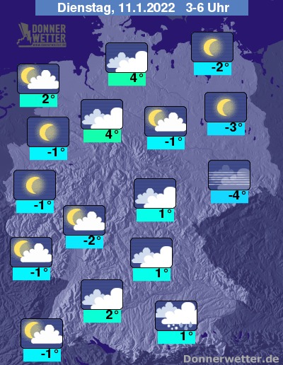 In der kommenden Nacht klart der Himmel im Westen, Nordosten und Osten verbreitet auf, sonst ist es oft stark bewölkt oder trüb. Ein paar Flocken oder Tropfen sind am Alpenrand möglich, sonst bleibt es aber weitgehend trocken. Stellenweise bildet sich Nebel. Die Temperatur sinkt auf 4 Grad in Hamburg und bis -4 Grad in Chemnitz.