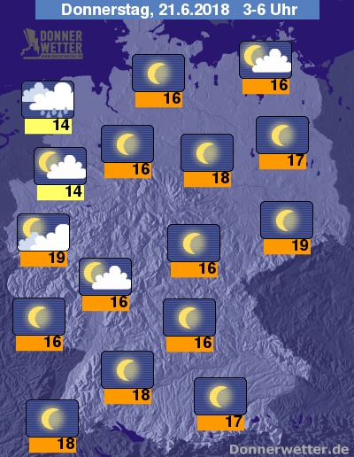 In der Nacht zum Donnerstag zeigt sich der Himmel weitgehend sternenklar, im Nordseeumfeld ziehen jedoch dichte Wolken und Regen auf, die sich bis zum Morgen etwa auf Schleswig-Holstein und die Nordwesthälfte Niedersachsens ausdenen. Im übrigen Land bleibt es trocken bei Tiefstwerten von 19 Grad im Rheinland und 14 Grad an der Ems.