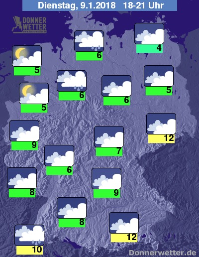 Heute Abend zieht sichder Himmel praktisch landesweit zu, dabei fällt im Südwesten sowie im Norden hier und da auch Regen, sonst bleibt es hingegen weitgehend trocken. Von der Nordsee bis zum Niederrhein ist es häufig aufgelockert bewölkt. Die Temperatur liegt bei 4 Grad in Rostock und etwa 12 Grad in Dresden.