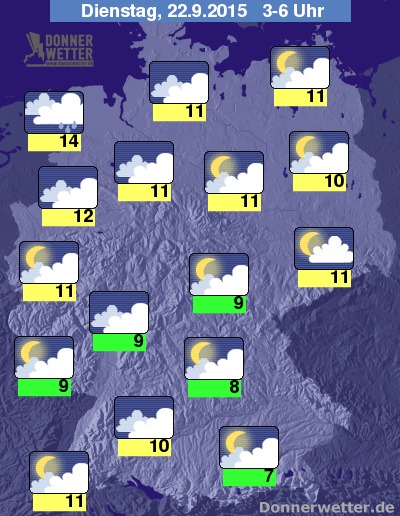 In der Nacht zum Dienstag bleibt es im Osten und Süden oft aufgelockert bewölkt, gebietsweise ist es hier aber auch schon stark bewölkt, jedoch trocken. Über die Nordwesthälfte des Landes ziehen hingegen meist dichte Wolken, die im Nordwesten und im äußeren Westen auch zeitweiligen Regen bringen, sonst bleibt es weitgehend trocken. Die Temperatur sinkt auf 14 Grad im nördlichen Emsland und bis 7 Grad im Chiemgau.