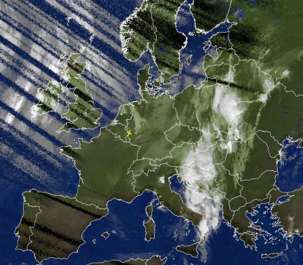 Auf dem Satellitenbild sind von der Adria bis in den Osten Europas hinein verbreitet kompakte Quellwolken zu erkennen, hier herrscht unter Tiefdruckeinfluss oft sehr unbeständiges und von teils kräftigen Schauern durchsetztes Wetter. Vor allem rund um die Adria und auch zum Beispiel über dem Balkan entwickeln sich zum Teil kräftige Gewitter.
