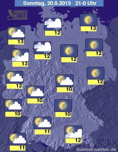 In der Nacht zum Montag zeigt sich der Himmel über der Südhälfte des Landes, sowie im Osten verbreitet sternenklar. Zeitweise dichte Wolken sind insbesonders im Nordwesten Deutschlands möglich, dabei ist aber nur gelegentlich auch etwas Regen möglich. In den übrigen Landesteilen zieht zumeist lockere, teils auch aufgelockerte Bewölkung durch und es bleibt trocken. Die Temperatur sinkt auf 13 Grad in Ostfriesland und bis 5 Grad in Münchner Umland. Stellenweise bildet sich Nebel oder Dunst.
