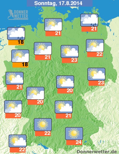 Der morgige Sonntag verspricht deutlich besseres Wetter als der Vortag, dabei können sich im Küstenumfeld unter teils dichten Wolken Schauer entwickeln, sonst bleibt es landesweit aber bei vielfach auch aufgelockerter, besonders im Süden bei geringer Bewölkung, verbreitet trocken. Im äußeren Süden ist es auch häufig sehr sonnig. Die Tageshöchstwerte erreichen herbstliche 18 Grad im Emsland und angenehme 24 Grad im Raum München.