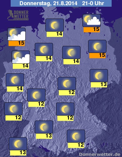 Heute Abend können im Norden zeitweise einige Wolken aufziehen, diese bringen jedoch selten etwas Regen, sonst ist der Himmel verbreitet leicht bewölkt bis sternenklar und es bleibt trocken. Die Abendtemperatur liegt bei 15 Grad in Berlin-Brandenburg und 12 Grad an den süddeutschen Mittelgebirgen.