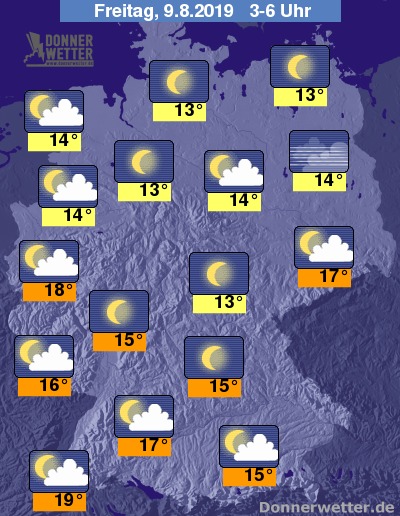 In der kommenden Nacht spielen Schauer keine große Rolle. Es ziehen zeitweise lockere Wolken auf sonst bleibt es klar. Nebel kann sich um Brandenburg bilden. Die Temperaturen liegen bei 13 Grad um Hamburg und 19 Grad im Schwarzwald.