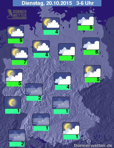 In der Nacht zum Dienstag ziehen über den Osten, die Mitte und den Südosten Deutschlands überwiegend dichte Wolken mit gelegentlich auch etwas Regen oder Sprühregen. Sonst ist es jedoch verbreitet nur locker bewölkt und vor allem im Südwesten und Süden auch oft sternenklar, dazu bleibt es trocken. Die Tiefstwerte liegen bei 9 Grad in Vorpommern und um 1 Grad im südlichen Baden-Würtemberg. Gebietsweise bildet sich Nebel oder Hochnebel, dabei ist stellenweise Glätte durch Rauhreif möglich.