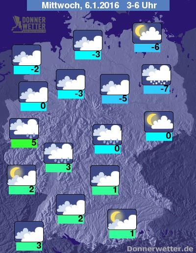 In der folgenden Nacht lockert die Bewölkung im Süden, Südwesten, in Sachsen, im Nordosten und im äußeren Norden gebietsweise auf, teils ist es hier auch stark bewölkt, jedoch weitgehend trocken. In einem breiten Streifen vom westlichen NRW bis in den Norden Bayerns fällt unter dichten Wolken immer wieder Regen, teils auch Schneeregen oder Schnee. Von der Landesmitte bis nach Berlin-Brandenburg fällt gebietsweise Schnee, dazu kann es vielerorts glatt auf den Straßen werden! Die Temperatur sinkt auf 5 Grad in Aachen und etwa -7 Grad im Raum Berlin. An der Nordsee weht zum Teil stürmischer Wind.