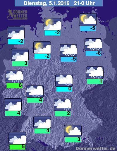 In der Nacht zum Mittwoch lockert die Bewölkung im Süden, Südwesten, in Sachsen, im Nordosten und im äußeren Norden gebietsweise auf, teils ist es hier auch stark bewölkt, jedoch weitgehend trocken. In einem breiten Streifen vom westlichen NRW bis in den Norden Bayerns fällt unter dichten Wolken immer wieder Regen, teils auch Schneeregen oder Schnee. Von der Landesmitte bis nach Berlin-Brandenburg fällt gebietsweise Schnee, dazu kann es vielerorts glatt auf den Straßen werden! Die Temperatur sinkt auf 5 Grad in Aachen und etwa -7 Grad im Raum Berlin. An der Nordsee weht zum Teil stürmischer Wind.