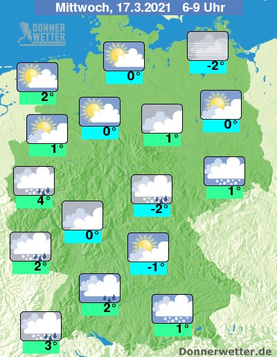 Der Mittwoch startet in der Nordhälfte mit einem überwiegend trockenen Mix aus Sonne, Wolken und einzelnen Nebelfeldern, in der Südhälfte bestimmt weiterhin dichte Bewölkung das Himmelsbild und immer wieder fällt Regen oder Schneeregen; in den südöstlichen Mittelgebirgen sowie den Alpen Schnee.