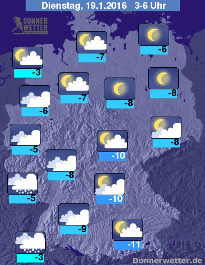 In der kommenden Nacht halten sich vom Westen bis in den Südwesten Deutschlands weitgehend dichte Wolken, dabei ist im Südwesten auch gebietsweise Schneefall möglich, dazu besteht erhöhte Glättegefahr, sonst bleibt es weitgehend trocken. Im Norden und Osten zeigt sich der Himmel oft sternenklar und dazu bleibt es trocken. In den übrigen Landesteilen ist es überwiegend aufgelockert bewölkt und trocken. Die Temperatur sinkt auf -3 Grad an der Nordseeküste und bis -11 Grad im Raum München.