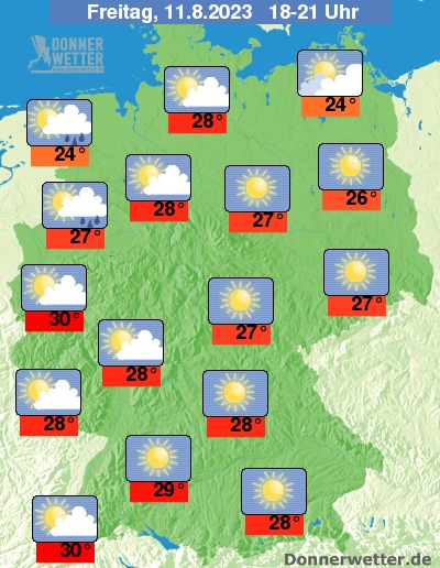 Heute Abend ziehen in den westlichen Landesteilen zum Teil dichte Wolken auf und im weiteren Verlauf können sich vom Mittel- bis zum Niederrhein Schauer bilden. Im übrigen Land bleibt es bei heiterem, zumeist sogar sonnigem Wetter trocken. Die Temperatur liegt bei 24 Grad an den Küsten und bis 30 Grad am Oberrhein.