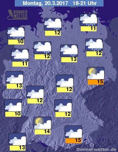 Heute Abend ist es im Norden weiterhin dicht bewölkt bei zeitweiligem Regen. Von der breiten Landesmitte bis in den Süden ist es überwiegend stark, hier und da aber auch mal aufgelockert bewölkt, dabei bleibt es trocken. Die Temperatur liegt bei 10 Grad an der Nordsee und 15 Grad in Dresden. An den Küsten weht ein teils stürmischer Wind.