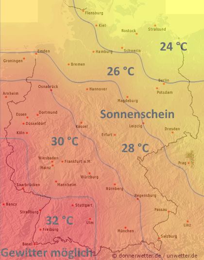 Heute Abend können über Berlin und Brandenburg teils kompaktere Wolken durchziehen, dabei sind einzelne Schauer möglich, sonst bleibt es über der Nordhälfte jedeoch weiterhin heiter bis sonnig und trocken. Im Südwesten und im Alpenvorland werden die Wolken immer dichter und nachfolgend sind hier auch einzelne Schauer sowie Gewitter möglich, sonst bleibt es bei wechselnder Bewölkung trocken. Die Temperatur liegt bei 19 Grad an der Nordsee und bis 27 Grad in Freiburg.