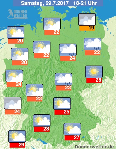 Heute Abend ist es über Sachsen und über dem Süden Deutschlands überwiegend heiter bis sonnig und dazu trocken. Im übrigen Bundesgebiet ist es hingegen teils stark, teils aber auch locker bis aufgelockert bewölkt, dazu bilden sich bevorzugt von der Mitte des Landes bis nach Berlin-Brandenburg hin gebietsweise Schauer und selten auch Gewitter, sonst bleibt es meist trocken. Die Temperatur liegt bei etwa 19 Grad in Rostock und bis 29 Grad in Freiburg.