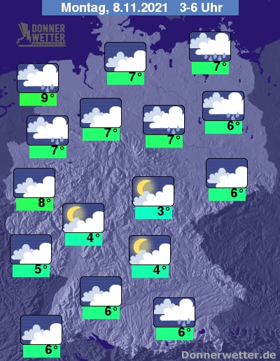 In der bevorstehenden Nacht zieht von Nordwesten her oft starke Bewölkung durch, dazwischen kann es aber auch hin und wieder etwas auflockern. Über der Südhälfte des Landes bleibt es weitgehend trocken, während sich weiter nach Norden hin gebietsweise Schauer bilden. Die Temperatur sinkt auf 9 Grad in Cuxhaven und bis 3 Grad in Erfurt. An den Küsten weht weiterhin ein oft stürmischer, im übrigen Norden ein teils starker Wind.
