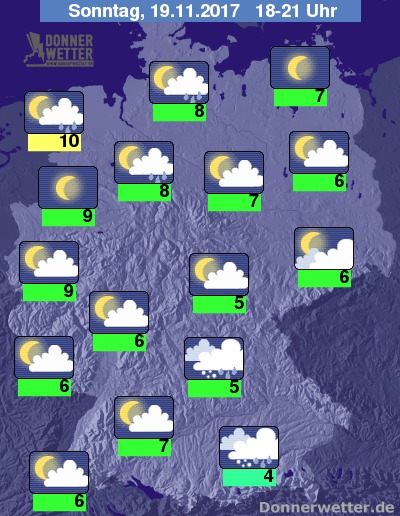 Heute Nachmittag bleibt es besonders im Osten und Süden Deutschland meist dicht bewölkt, dabei fällt zeitweise Regen, Schneeregen oder auch Schnee. Im übrigen Land ist es auch zum Teil stark bewölkt, teils zeigen sich jedoch auch Aufheiterungen, dazu sind einzelne Schauer möglich. Die Temperatur liegt bei 4 bis 10 Grad. Über der Nordhälfte weht ein teils starker, an den Küsten ein oft stürmischer Wind.