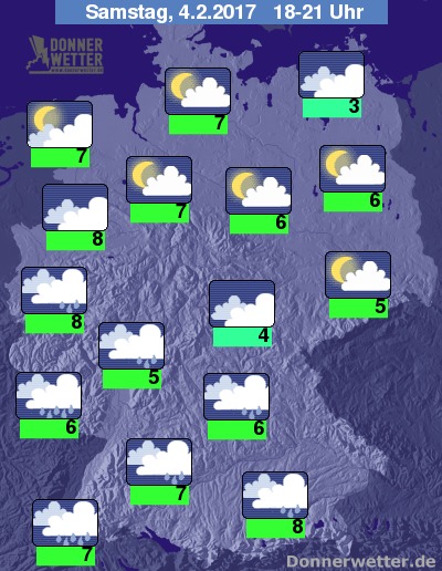 Heute Abend halten sich über der Südwesthälfte dichte Wolken, dazu fällt zeitweise Regen. Meist locker oder aufgelockert, hier und da stärker bewölkt ist es hingegen im Norden und Osten der Republik, dabei bleibt es trocken. Die Abendwerte liegen bei 3 Grad in Neubrandenburg und um 8 Grad in Düsseldorf.