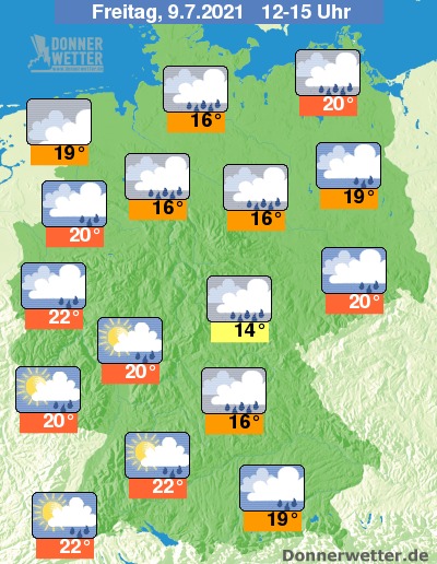Heute Nachmittag zeigen sich über dem Süden und Westen gebietsweise Aufheiterungen, oft ziehen hier aber auch dichte Wolken durch, die sowohl Schauer als auch vereinzelte Gewitter bringen können. Im übrigen Bundesgebiet ist es weitgehend dicht bewölkt und es bilden sich wiederholt Schauer und örtliche Gewitter. Die Temperatur liegt bei 14 Grad im Eichsfeld und bis 22 Grad im Breisgau.