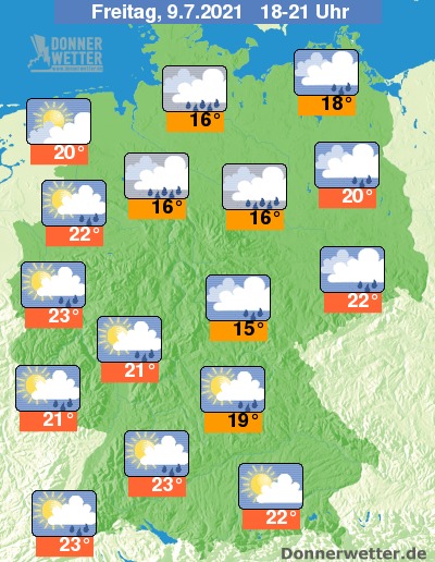 Heute Abend kommt die Sonne im Süden und Westen noch besser zum Zuge und es bilden sich nur noch vereinzelt Schauer. Über der Nordosthälfte bleibt es weitgehend bedeckt und es bilden sich häufig Schauer, ganz lokal auch noch Gewitter. Die Temperatur liegt bei 15 Grad in Jena und bis 23 Grad in Freiburg.