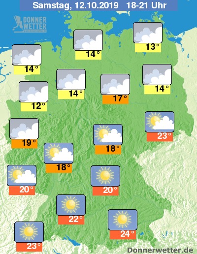 Heute Abend klingen die Niederschläge im Norden meist ab, es bleibt jedoch hier, sowie im Westen Deutschland meist stark bewölkt. Weiter nach Südosten hin ist es oft heiter bis sonnig, gebietsweise ziehen aber auch hier einige Wolken durch, dabei bleibt es trocken. Die Temperatur liegt bei 12 Grad im südlichen Emsland und bis zu 24 Grad in München.
