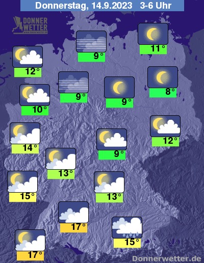 In der kommenden Nacht klart der Himmel über der Nordhälfte Deutschlands verbreitet auf, dazu bleibt es trocken. Weiter nach Süden hin werden die Wolken dichter und im Alpenvorland fällt auch gebietsweise Regen, sonst bleibt es aber weitgehend trocken. Die Temperatur sinkt auf 17 Grad in Stuttgart und 8 Grad in Berlin.
