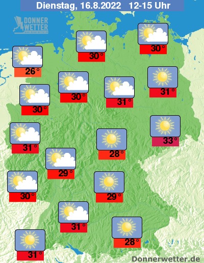 Heute Nachmittag ist es verbreitet heiter oder sonnig, im Westen sind hier und da auch mehr Wolken möglich, dabei bleibt es trocken. Die Temperatur liegt bei 26 Grad an der Nordsee und bis 33 Grad in der Lausitz.