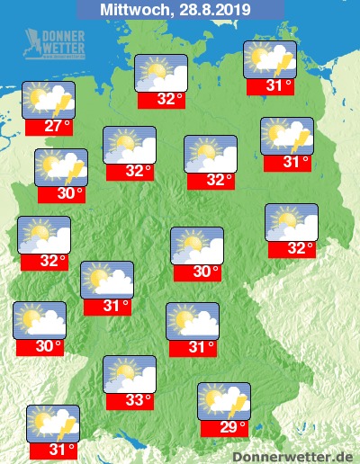 Auch Wochenmitte verbreitet mit Temperaturen um 30 Grad.