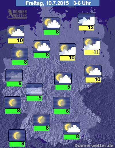 In der Nacht zum Freitag ist es im Norden und Osten von Deutschland oft stark und sonst meist aufgelockert bewölkt, dazu bleibt es trocken. Über der Südwesthälfte des Landes zeigt sich der Himmel hingegen verbreitet sternenklar und es bleibt ebenso trocken. Die Temperatur sinkt auf 13 Grad in Vorpommern und bis 5 Grad am Odenwald.