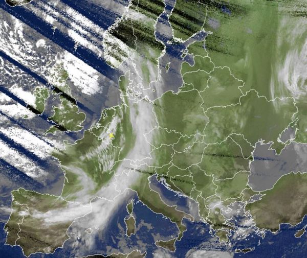Auf dem heutigen Satellitenfoto ist ein langgestrecktes Wolkenband zu erkennen, das vom westlichen Mittelmeerraum über die Westalpen, die Osthälfte der Bundesrepublik und weiter bis nach Skandinavien reicht. Hierbei handelt es sich um das Frontensystem des Sturmtiefs "Yoda" mit Zentrum über der Nordsee. Unter den kompakten Wolken fiel und fällt weiterhin noch verbreitet langanhaltender und teils ergiebiger Regen.