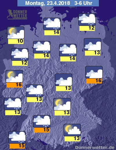 Heute Abend ist es im Süden heiter oder auch mal wechselnd bewölkt, jedoch weitgehend trocken, im Rest der Republik sind allerdings neben heiteren Abschnitten auch dichte Wolken möglich, dabei können sich zum Teil kräftige Schauer und Gewitter entwickeln. Die Temperatur liegt bei 18 Grad in Rostock und etwa 27 Grad in Bonn.
