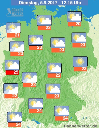 Heute Nachmittag ist es noch überwiegend heiter oder sonnig, in den westlichen Landesteilen ziehen allerdings auch schon hier und da etwas dichtere Wolken auf, es bleibt aber landesweit noch trocken. Die Temperatur steigt auf 20 Grad an der Ostsee und bis 25 Grad im Rheinland.