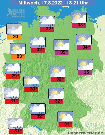 Heute Abend nimmt auch die Bewölkung über der Osthälfte mehr und mehr zu, jedoch bleibt es hier noch weitgehend trocken. Im übrigen Land ist es häufig stark, teils auch aufgelockert bewölkt, dabei bilden sich gebietsweise Schauer, örtlich entwickeln sich auch Gewitter. Die Temperatur liegt bei 20 Grad in Emden und bis zu 35 Grad in Magdeburg.